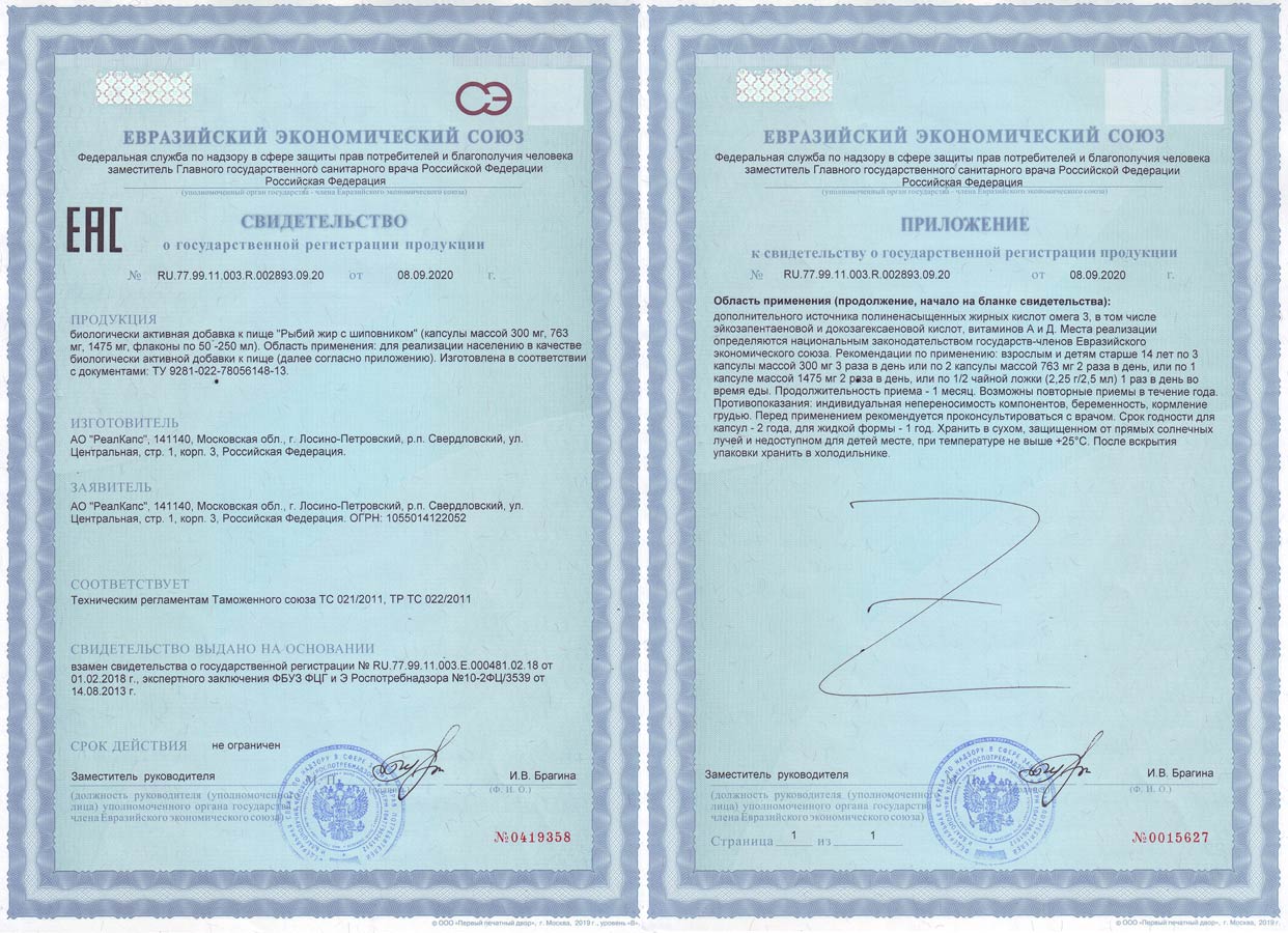 “Fish Oil with Sea Buckthorn” is registered by the Russian Federal Service for Surveillance on Consumer Rights Protection and Human Wellbeing (Rospotrebnadzor). Certificate of State Registration No. RU.77.99.11.003.E.001194.03.18 dated 23.03.2018, Technical Specifications (TS) 9281-022-78056148-13.
