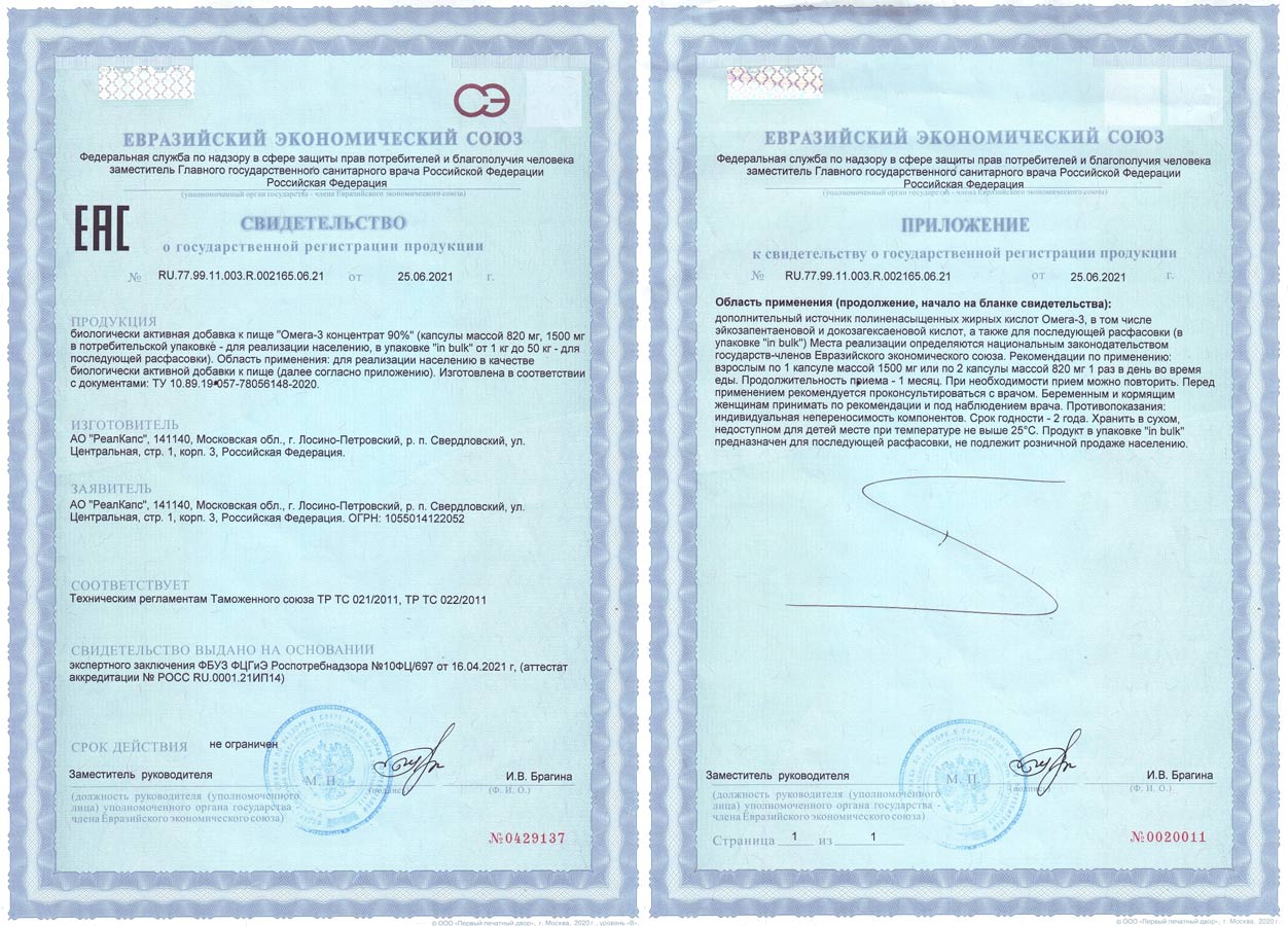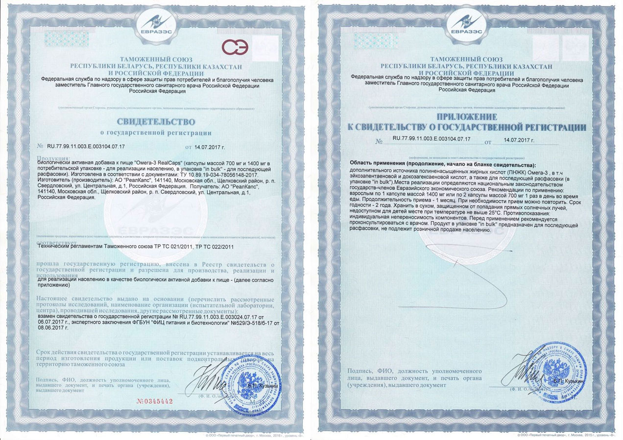 “Omega-3 RealCaps” has the registration of the Russian Federal Service for Surveillance on Consumer Rights Protection and Human Wellbeing (Rospotrebnadzor). Certificate of State Registration No. RU.77.99.11.003.E.003104.07.17 dated 14.07.2015.