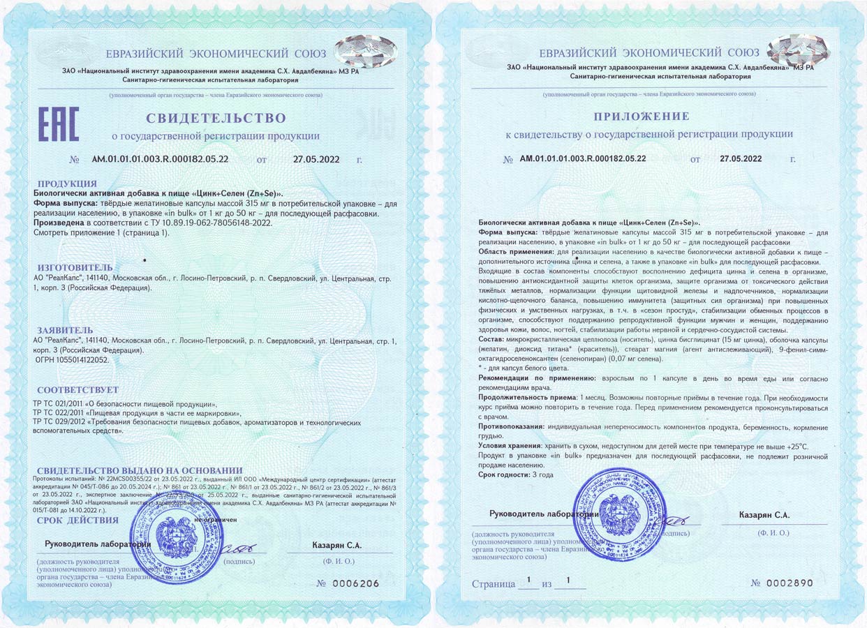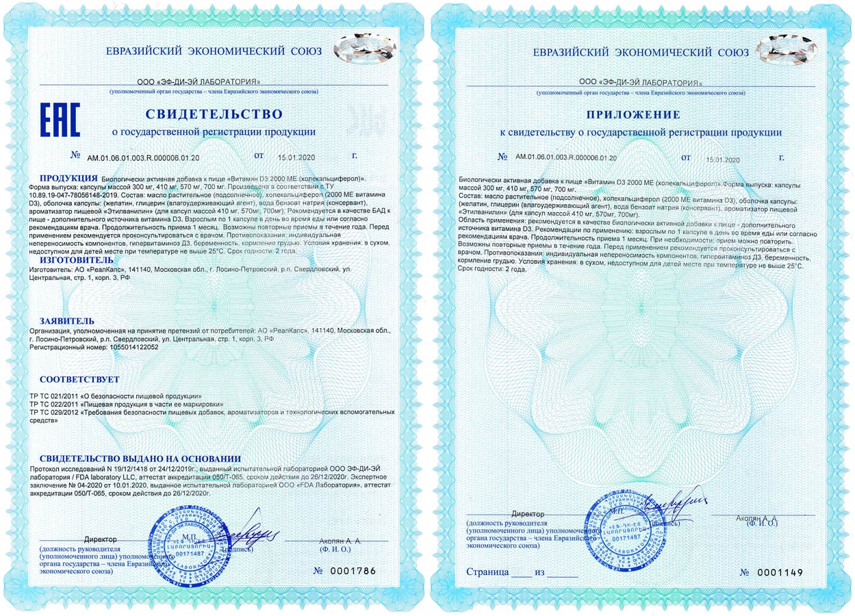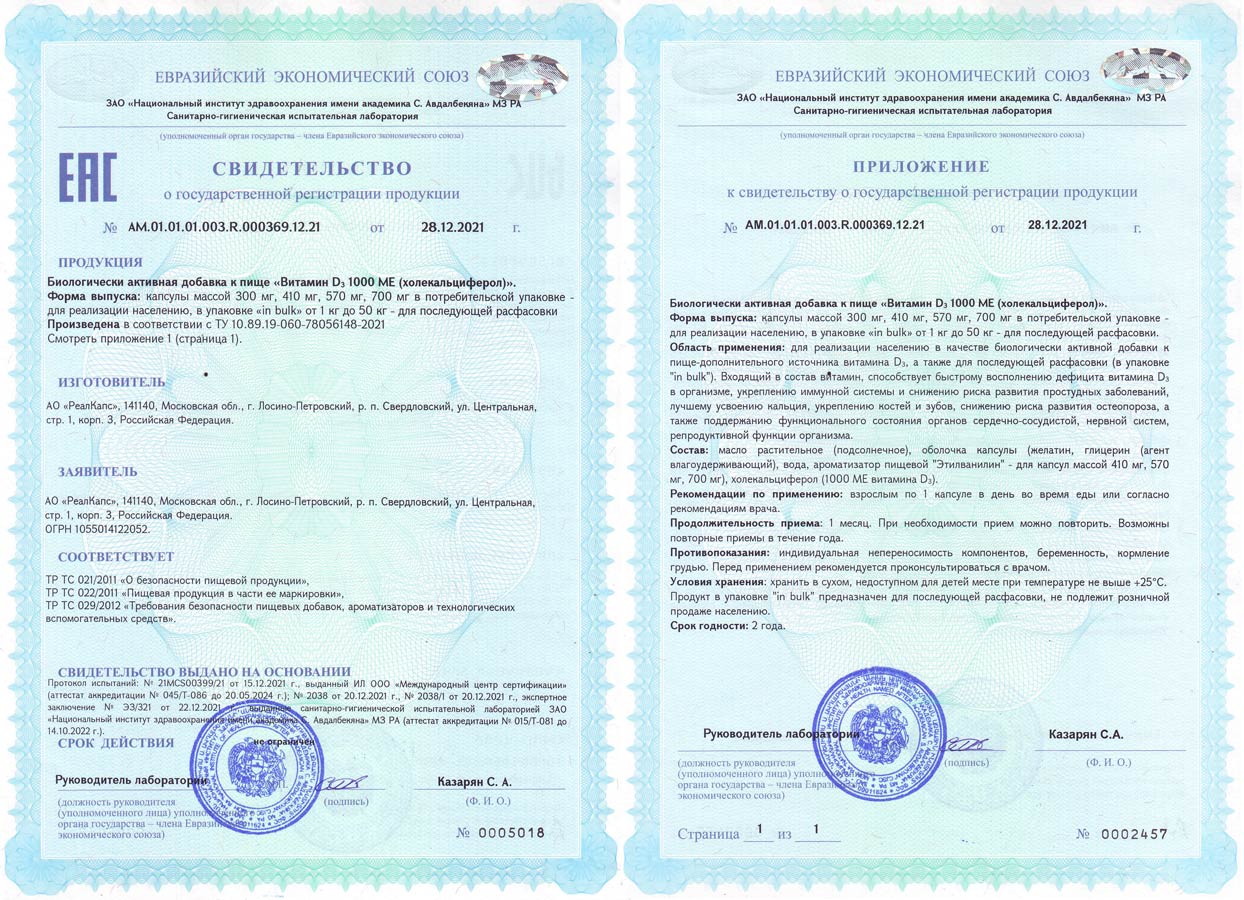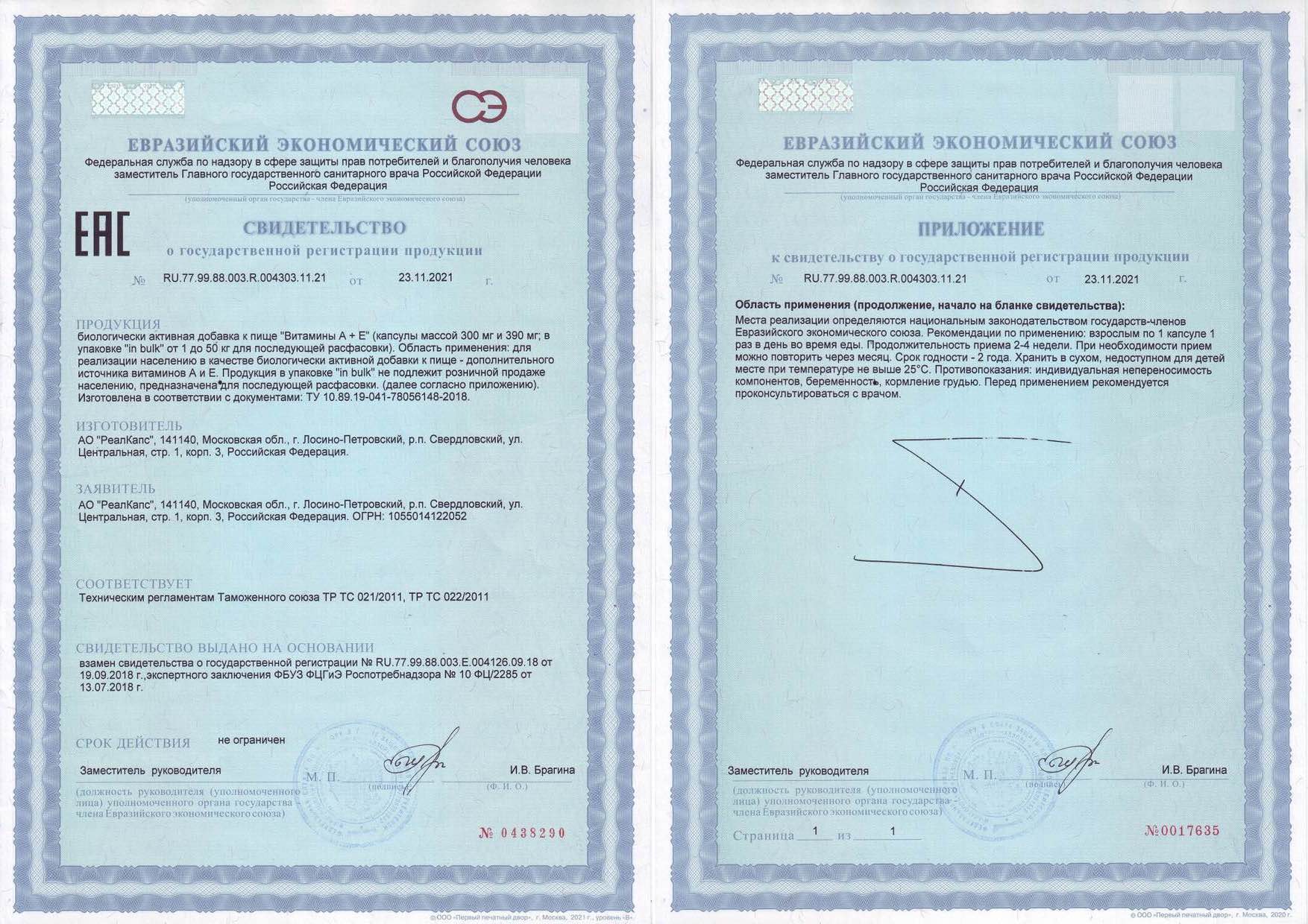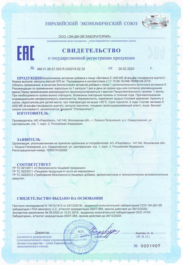 Vitamin E has the registration of the Russian Federal Service for Surveillance on Consumer Rights Protection and Human Wellbeing (Rospotrebnadzor). Certificate of State Registration No. RU.77.99.88.003.E.004812.11.17 dated 13.11.2017, Technical Specifications (TS) 10.89.19-032-78056148-2016.