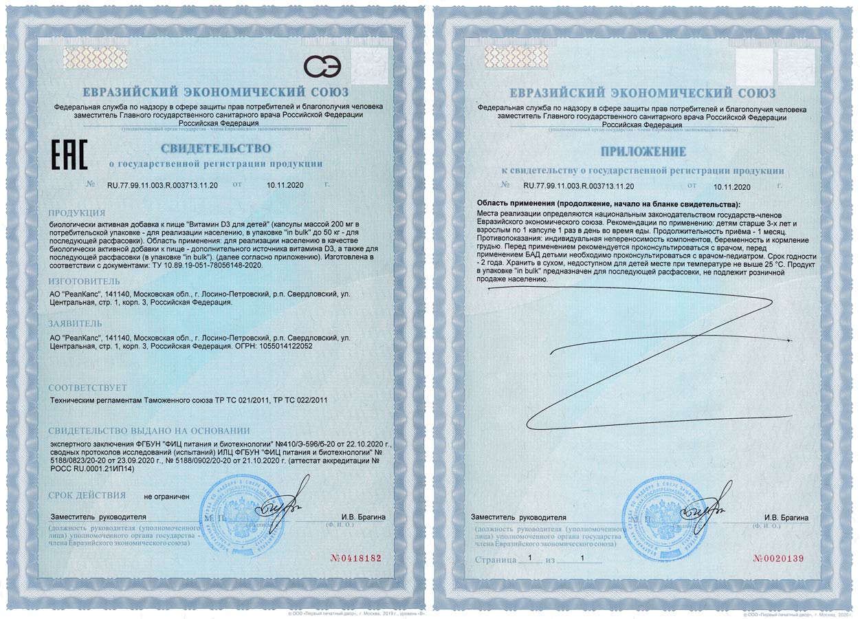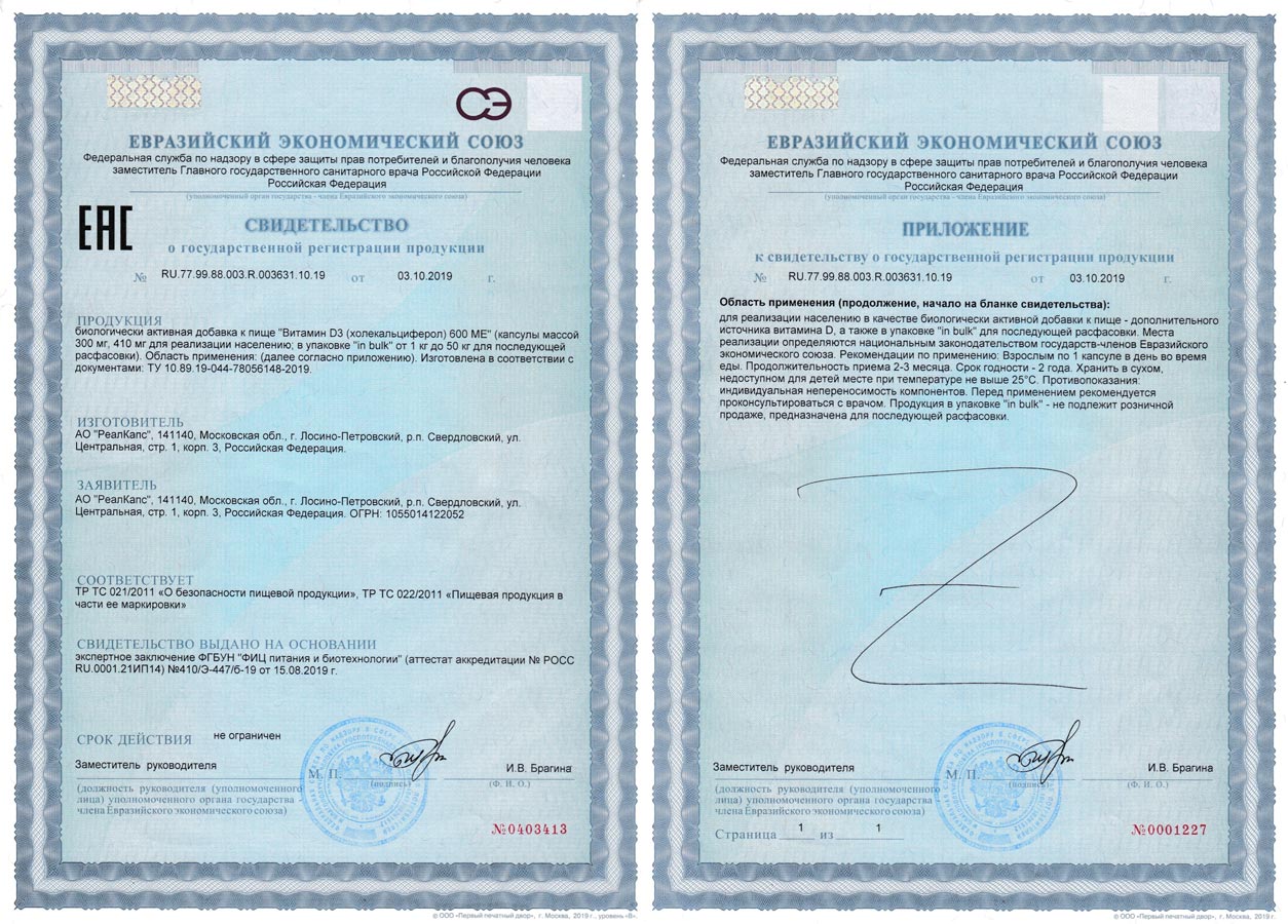 Dietary supplement "Vitamin D3 (cholecalciferol) 600 IU" is registered by the Federal service for supervision of consumer protection and human welfare. Certificate of State Registration No. RU.77.99.88.003.R.003631.10.19 dated 03.10.2019, Technical Specifications (TS) 10.89.19-044-78056148-2019.