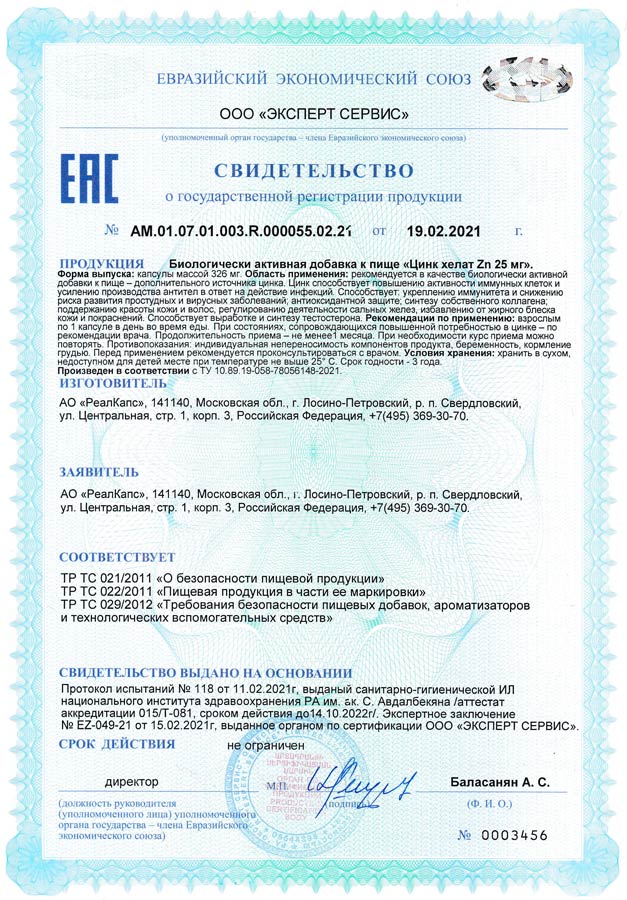 Certificate of state registration No. AM.01.06.01.003.R.000019.02.20 dated 26.02.2020, TU 10.89.19-048-78056148-2019.